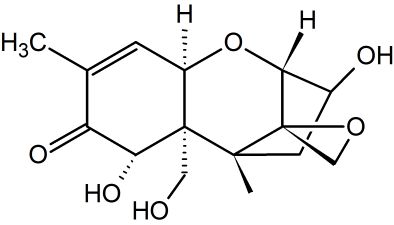嘔吐毒素主體成分為DON(deoxynivalenol, 脫氧雪腐鐮刀菌烯醇),屬于單端孢霉烯族化合物,主要由禾谷鐮刀菌、尖孢鐮刀菌、串珠鐮刀菌、擬枝孢鐮刀菌、粉紅鐮刀菌、雪腐鐮刀菌等鐮刀菌產(chǎn)生。另外,頭孢菌屬、漆班菌屬、木霉屬等的菌株都可產(chǎn)生該毒素。單端孢霉烯族毒素共有150多種,是一類強有力免疫抑制劑,所引起典型癥狀是采食量降低,所以這類毒素又叫飼料拒食毒素。嘔吐毒素(DON)是其中最重要一種毒素,主要來自鐮刀菌屬(Fusarium),尤其是禾谷鐮刀菌(Fusariumgraminearum)和黃色鐮刀菌(Fusarium culmorum)。由于它可以引起豬的嘔吐,故又名嘔吐毒素(vomitoxin,VT)。由于它可以引起豬的嘔吐而得名,對人體有一定危害作用,歐盟分類標(biāo)準(zhǔn)為三級致癌物。