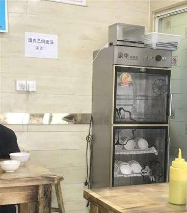 市民李先生向記者反映,他發(fā)現(xiàn)一些面館、小吃店等擺放的消毒柜形同虛設(shè),“從消毒碗柜拿出來的餐具經(jīng)常濕漉漉的,還有些消毒柜根本沒放餐具,成了雜物柜?!?月29日,記者來到城西區(qū)微波巷一家小吃店,只見店內(nèi)的消毒柜擺放在顯眼處,打開一看,里面擺滿了碗,碗下面墊著一層白色的毛巾,旁邊的電線耷拉在一旁,并沒有通電。當(dāng)記者問及為何沒有通電時,服務(wù)員說因為剛給自己手機充電,所以拔下了消毒柜的電源。隨后,記者又來到夏都大街一家火鍋店,店內(nèi)的消毒柜內(nèi)雖然擺放著碗筷,但同樣沒有插上電源。一名女服務(wù)員說:“忘記插電了。”記者隨后又走訪了海湖新區(qū)部分中小餐館,發(fā)現(xiàn)大多數(shù)餐館配備了消毒柜,但一部分呈斷電狀態(tài),有的甚至成了雜物柜,根本沒有起到消毒殺菌作用。