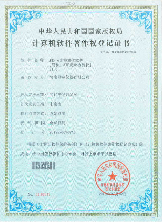 近日,河南冠宇儀器有限公司(以下簡稱:冠宇儀器)繼之前的多項(xiàng)軟件著作權(quán)證書及專利證書之后,又獲由中華人民共和國國家版權(quán)局頒發(fā)的一項(xiàng)“ATP熒光檢測(cè)儀計(jì)算機(jī)軟件著作權(quán)登記證書”,一系列的權(quán)威肯定,彰顯了冠宇儀器強(qiáng)大的技術(shù)研發(fā)能力,也體現(xiàn)出公司為客戶提供優(yōu)質(zhì)產(chǎn)品的強(qiáng)大決心。