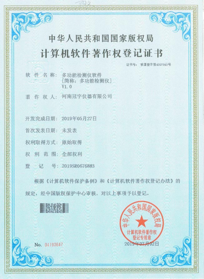 祝賀冠宇儀器“多功能食品安全檢測儀”榮獲軟件著作權(quán)證書