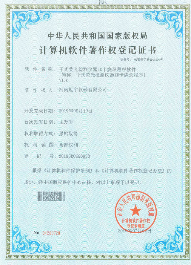 近日,河南冠宇儀器有限公司(以下簡稱:冠宇儀器)繼之前的多項軟件著作權(quán)證書及專利證書之后,又獲由中華人民共和國國家版權(quán)局頒發(fā)的一項“干式熒光檢測儀器ID卡燒錄程序計算機(jī)軟件著作權(quán)登記證書”,一系列的權(quán)威肯定,彰顯了冠宇儀器強(qiáng)大的技術(shù)研發(fā)能力,也體現(xiàn)出公司為客戶提供優(yōu)質(zhì)產(chǎn)品的強(qiáng)大決心。