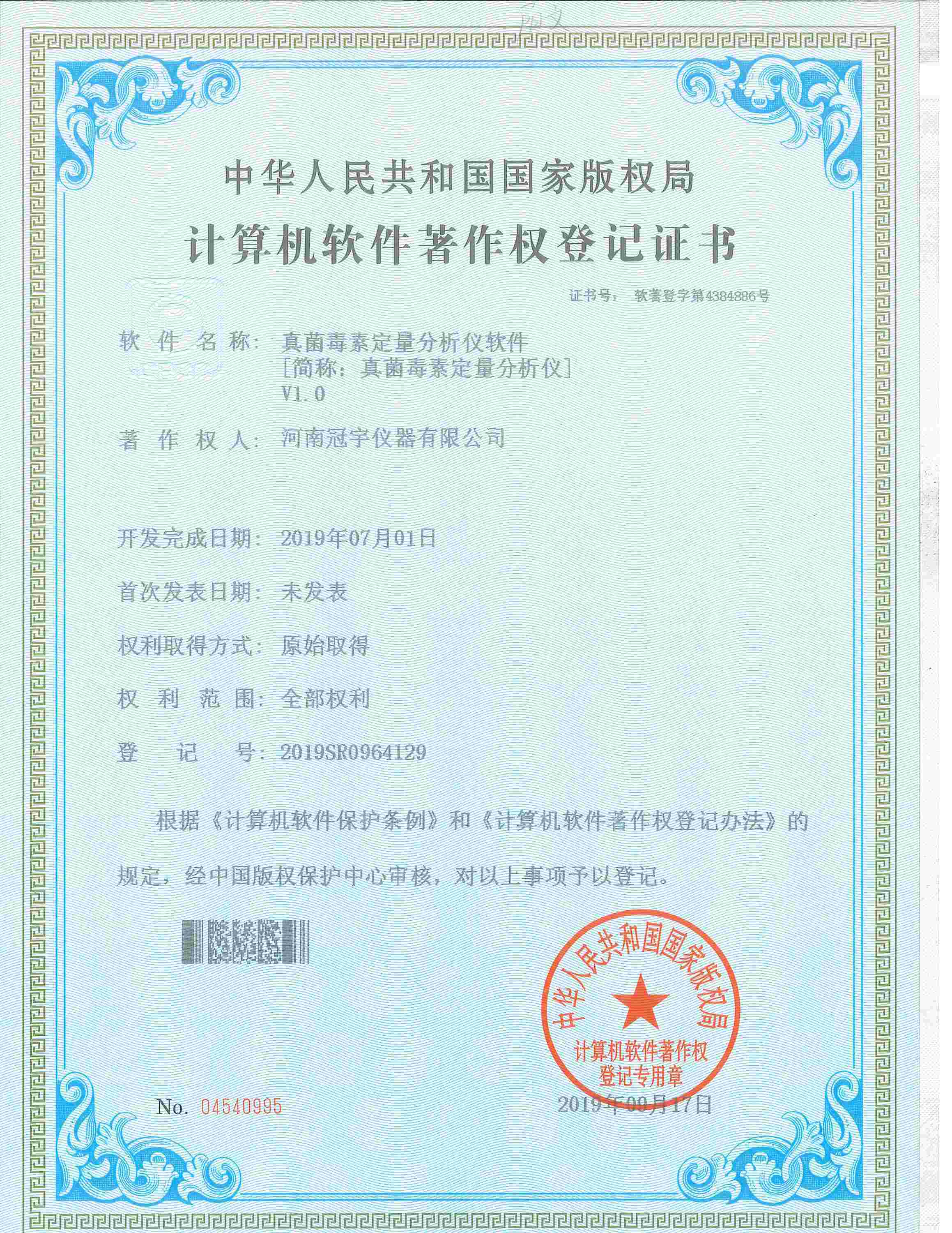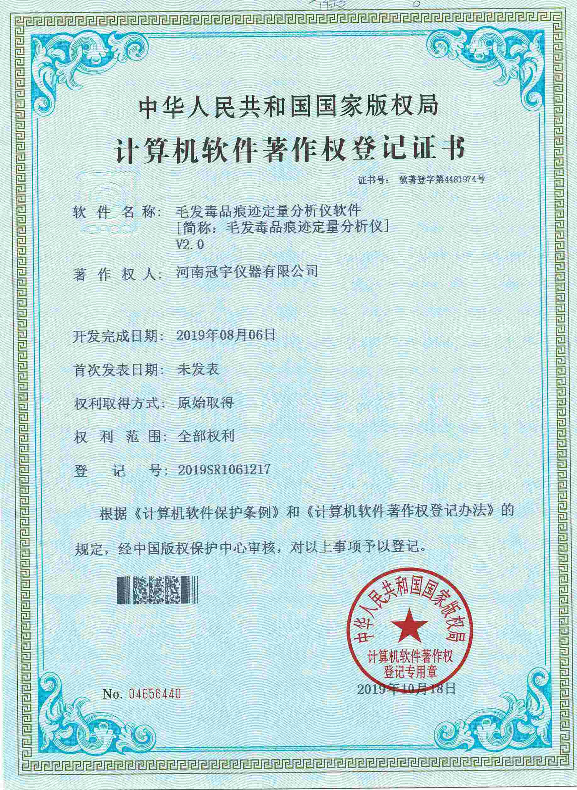 近日,河南冠宇儀器有限公司(以下簡稱:冠宇儀器)繼之前的多項軟件著作權(quán)證書及專利證書之后,又獲由中華人民共和國國家版權(quán)局頒發(fā)的一項“手持式毛反毒品痕跡定量分析儀計算機軟件著作權(quán)登記證書”,一系列的權(quán)威肯定,彰顯了冠宇儀器強大的技術(shù)研發(fā)能力,也體現(xiàn)出公司為客戶提供優(yōu)質(zhì)產(chǎn)品的強大決心。