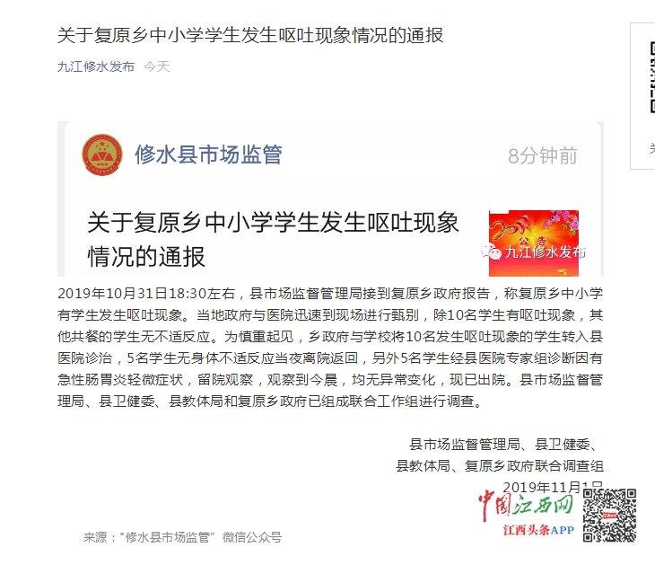 10月31日,修水縣復原鄉(xiāng)中小學學生發(fā)生嘔吐事件,當日下午80名學生被送至當?shù)乜h城醫(yī)院檢查,10名學生被收治。