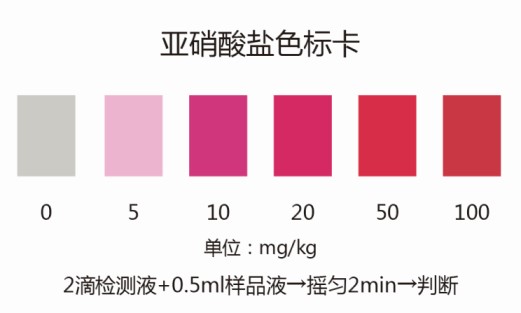 2.1:2分鐘后觀察檢測管中顏色的深淺,紫紅色顏色越深,表示樣品中亞硝酸鹽的含量越高。