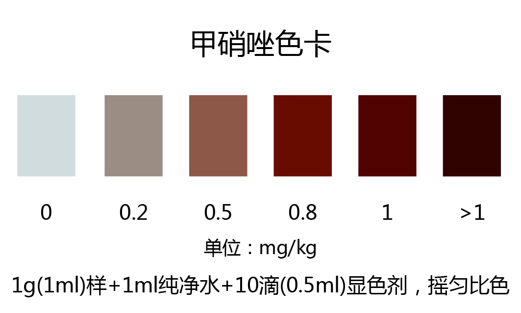 取1g(1ml)樣品于試管中,加入1ml純凈水,搖勻,加入10滴(0.5ml)檢測液,60±10℃水浴加熱2分鐘,取出后進行比色,顏色越深,甲硝唑的含量越高。