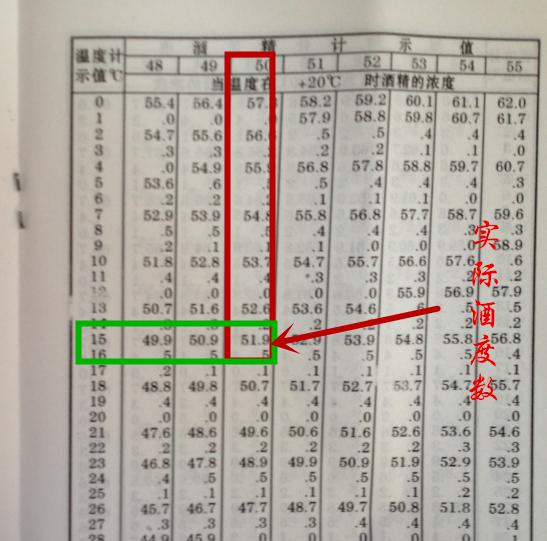 1.5:找到換算表,找到縱向酒度計(jì)讀數(shù)和橫向溫度計(jì)讀數(shù)對(duì)應(yīng)的交叉值即為白酒實(shí)際酒精度(上右圖);