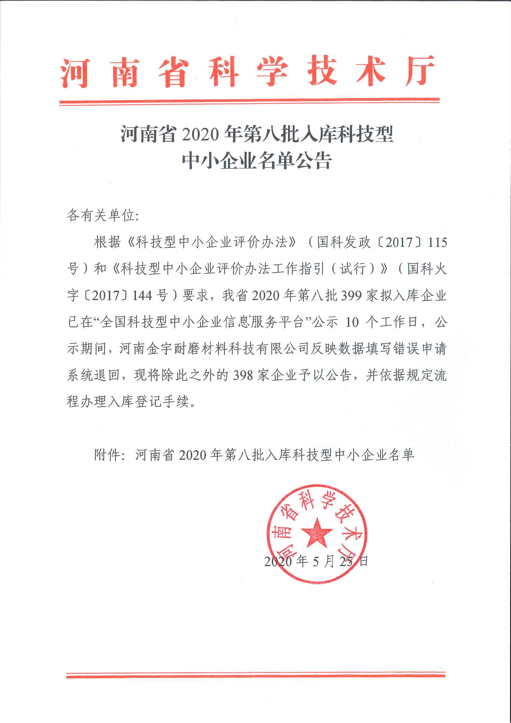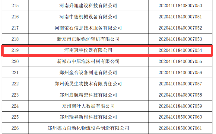 根據(jù)《科技型中小企業(yè)評價辦法》(國科發(fā)政〔2017〕115號)評價指標要求,國家科技部火炬中心《關于組織開展2020年科技型中小企業(yè)評價工作的通知》(國科火字〔2020〕44號),認定河南冠宇儀器有限公司成為“國家科技型中小企業(yè)”,并獲得榮譽稱號,編號為:202041018400007054。