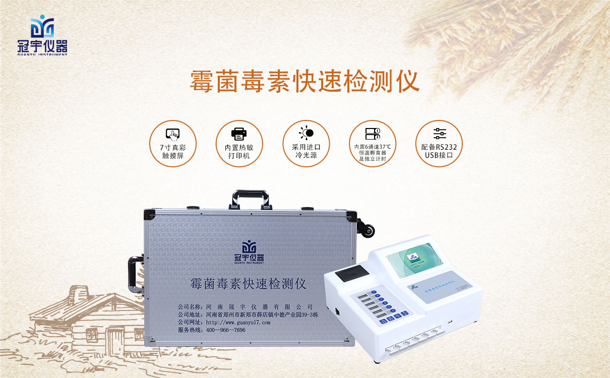 發(fā)霉的食物對人身體危害,冠宇儀器霉菌毒素快速測試儀能夠快速定量檢測糧食、飼料、谷物、食用油、調(diào)味品等食品中黃曲霉毒素、T2毒素、嘔吐毒素、赭曲霉毒素、伏馬毒素、玉米赤霉烯酮含量,適用于糧油監(jiān)測中心、糧油飼料生產(chǎn)加工、食品加工貿(mào)易、畜禽養(yǎng)殖戶自查、工商質(zhì)監(jiān)部門用于市場快速篩查等維護(hù)我們的食品安全。