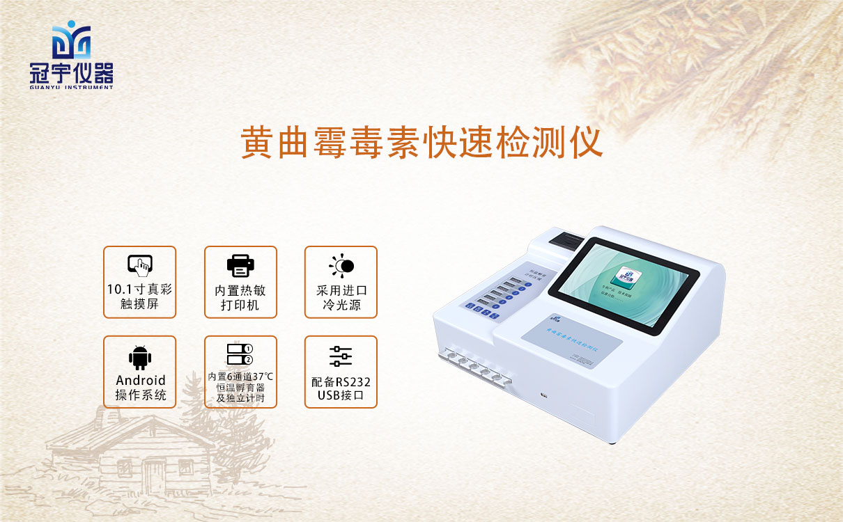 冠宇儀器黃曲霉毒素快速測(cè)試儀能夠快速定量檢測(cè)玉米、小麥、大米、大麥、小米和燕麥等谷物、飼料、面粉、食用油、調(diào)味品中黃曲霉毒素B1,適用于糧庫(kù)收糧檢測(cè)、糧油監(jiān)測(cè)中心、糧油飼料生產(chǎn)加工、食品加工貿(mào)易、畜禽養(yǎng)殖戶自查、工商質(zhì)監(jiān)部門用于市場(chǎng)快速篩查等。