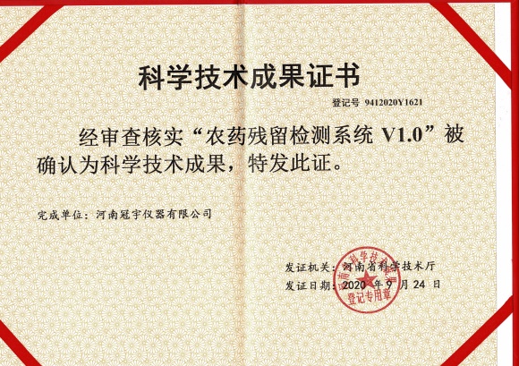 河南冠宇儀器有限公司(以下簡(jiǎn)稱:冠宇儀器)繼多項(xiàng)軟件著作權(quán)證書(shū)、實(shí)用新型專利證書(shū)、計(jì)算機(jī)軟件著作權(quán)等一系列證書(shū)之后,又獲由河南省科學(xué)技術(shù)廳頒發(fā)的一項(xiàng)“農(nóng)藥殘留檢測(cè)系統(tǒng)V1.0科學(xué)技術(shù)成果證書(shū)”,一系列的權(quán)威肯定,彰顯了冠宇儀器強(qiáng)大的技術(shù)研發(fā)能力,也體現(xiàn)出公司為客戶提供優(yōu)質(zhì)產(chǎn)品的強(qiáng)大決心。