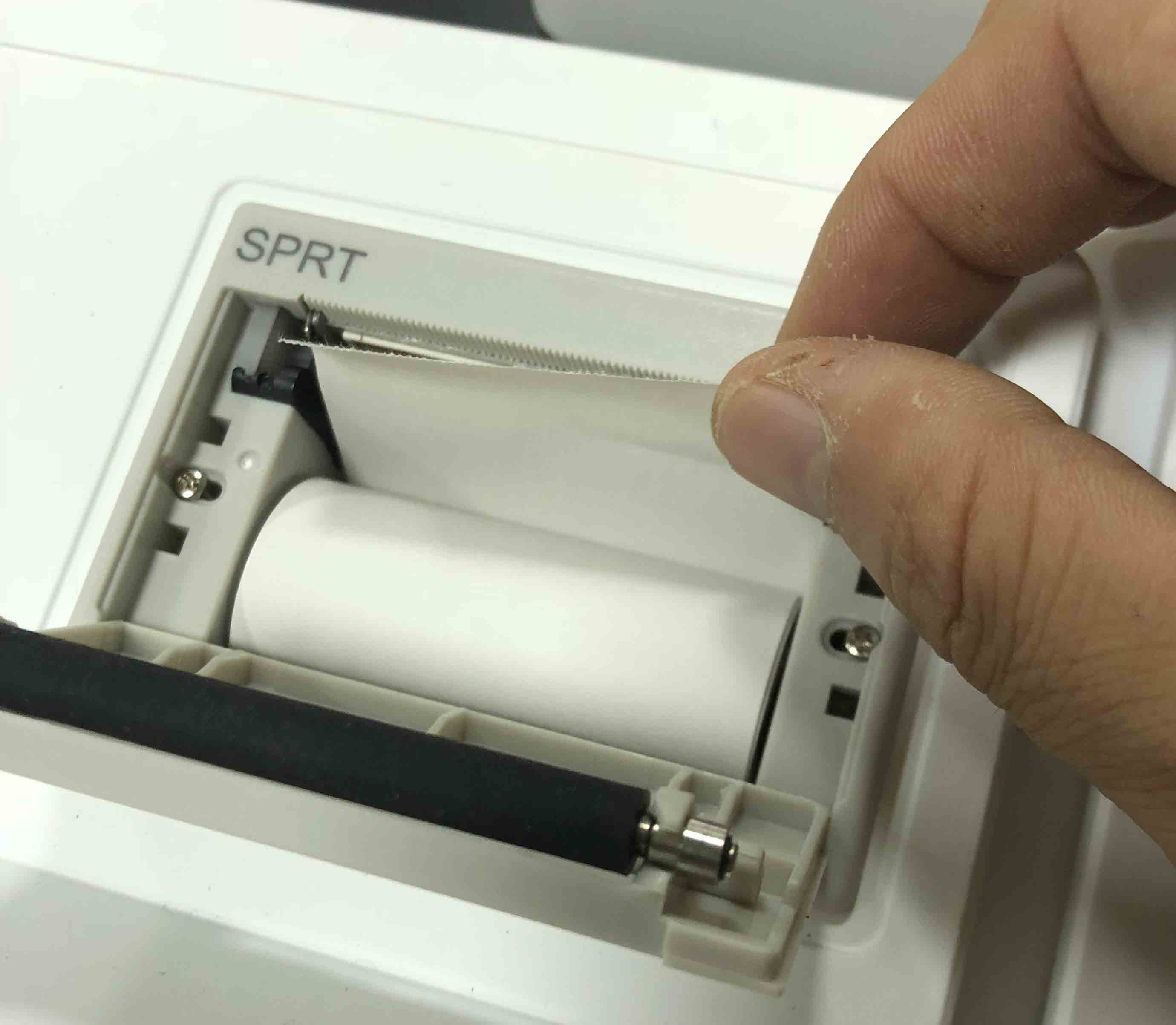 第二步:打印機紙盒中取出已用完的打印紙芯筒,裝入新的打印紙(注:打印紙有正反面),并將打印紙紙頭輕輕拉出一小段(以蓋上打印機面板后,打印紙能超出打印機的出紙口即可)。