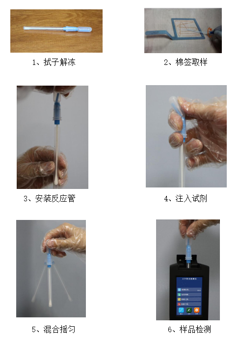 6、樣本檢測:將拭子插入處于待檢測界面的ATP儀器實(shí)驗(yàn)倉內(nèi),閉合儀器上蓋,開始檢測。