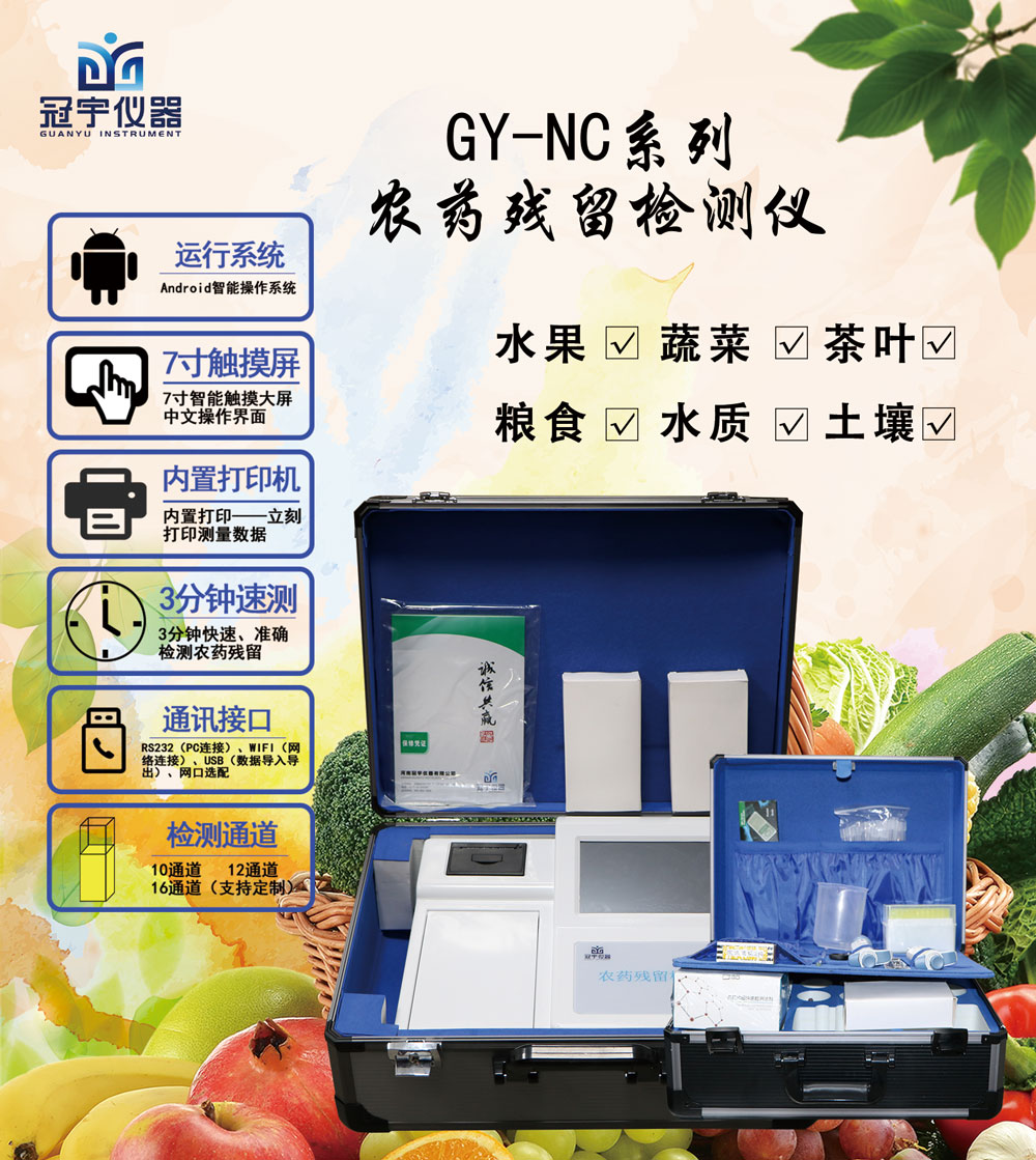 農(nóng)藥殘留傷害不容忽視,相應(yīng)的監(jiān)管部門也應(yīng)加強(qiáng)農(nóng)藥殘留的監(jiān)管檢控工作,維護(hù)好食品安全。冠宇儀器新一代智能型農(nóng)藥殘留檢測(cè)儀可廣泛應(yīng)用于各級(jí)政府蔬菜檢測(cè)中心、農(nóng)貿(mào)市場(chǎng)、超市、環(huán)保機(jī)構(gòu)、蔬菜種植基地、飯店、車載及實(shí)驗(yàn)室等食品安全檢測(cè)與監(jiān)控場(chǎng)所等單位對(duì)果蔬中農(nóng)藥殘留的檢測(cè)。能準(zhǔn)確、快速檢測(cè)出蔬菜、水果、糧食、茶葉以及土壤中有機(jī)磷和氨基甲酸脂類農(nóng)藥殘留的快速檢測(cè)。