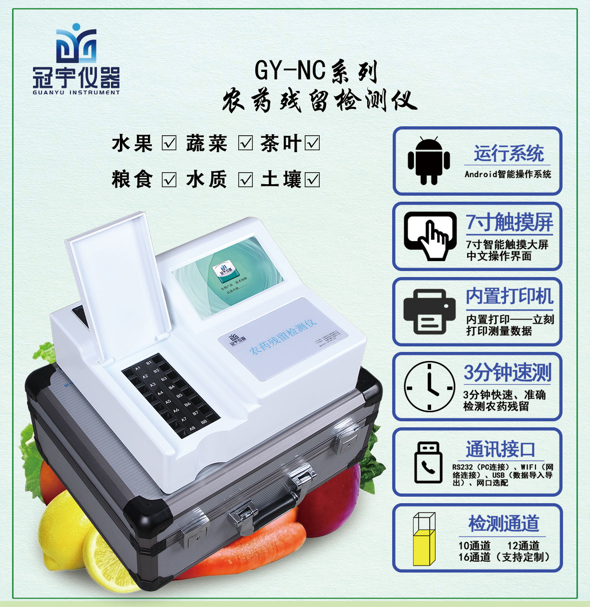 河南冠宇儀器有限公司生產(chǎn)的新一代智能型農(nóng)藥殘留檢測儀;是根據(jù)農(nóng)業(yè)標準方法(NY/T 448-2001)和國家標準(GB/T5009.199-2003)中的酶抑制率法,嚴格遵循《GB/T5009.199-2003蔬菜中有機磷和氨基甲酸酯類農(nóng)藥殘留快速檢測方法標準》中的規(guī)定對蔬菜中有機磷和氨基甲酸酯類農(nóng)藥殘留的快速檢測。