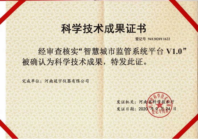 河南冠宇儀器有限公司(以下簡稱:冠宇儀器)繼多項軟件著作權(quán)證書、實用新型專利證書、計算機(jī)軟件著作權(quán)等一系列證書之后,又獲由河南省科學(xué)技術(shù)廳頒發(fā)的一項“智慧城市監(jiān)管系統(tǒng)平臺V1.0科學(xué)技術(shù)成果證書”,一系列的權(quán)威肯定,彰顯了冠宇儀器強大的技術(shù)研發(fā)能力,也體現(xiàn)出公司為客戶提供優(yōu)質(zhì)產(chǎn)品的強大決心。