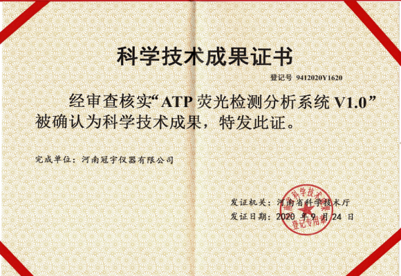 祝賀冠宇儀器“ATP熒光檢測分析系統(tǒng)V1.0”榮獲科學(xué)技術(shù)成果證書
