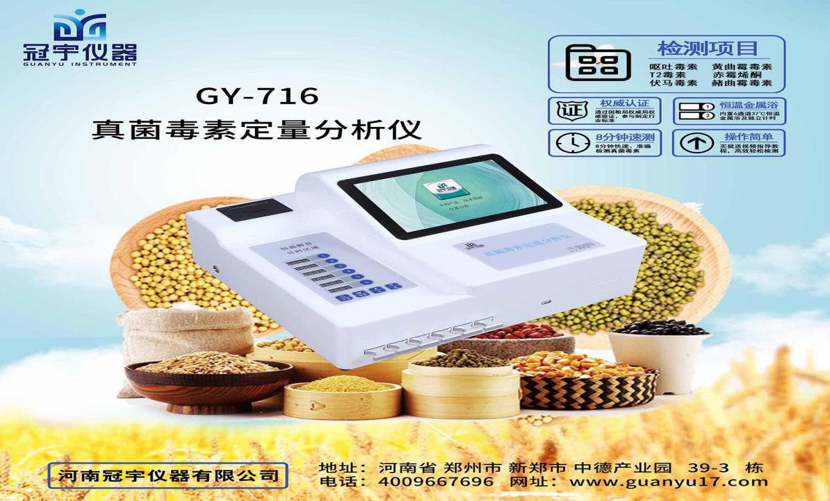 綜上,真菌毒素對人們的危害不容忽視,要加強相應的監(jiān)管檢控工作,冠宇儀器GY-710真菌毒素殘留定量分析儀應用競爭抑制免疫層析的原理,通過檢測線熒光定量卡中的熒光強弱程度,定量分析待檢樣品中真菌毒素殘留含量。真菌毒素快速檢測儀能夠快速定量檢測糧食、飼料、谷物、食用油、調(diào)味品等食品中T2毒素、嘔吐毒素、赭曲霉毒素、伏馬毒素、玉米赤霉烯酮,真菌毒素殘留定量分析儀適用于糧油監(jiān)測中心、糧油飼料生產(chǎn)加工、食品加工貿(mào)易、畜禽養(yǎng)殖戶自查、工商質(zhì)監(jiān)部門用于市場快速篩查等。