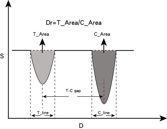 Dr值:通過光學(xué)傳感器獲得的信號曲線上T線對應(yīng)峰面積(T_Area)與C線對應(yīng)峰面積(C_Area)之比值。即:Dr值 = T_Area/C_Area,如圖2所示,為從儀器上獲得的信號曲線的對應(yīng)關(guān)系。用標(biāo)準(zhǔn)條帶S0、S1、S2和S3檢測,記錄顯示屏顯示的Dr值。
