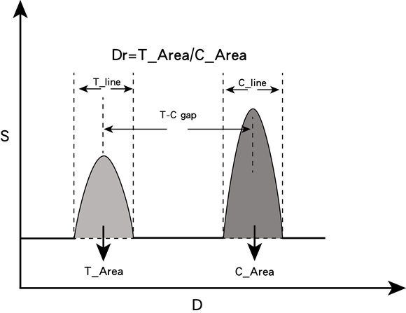 GY-710真菌毒素殘留定量分析儀應(yīng)用時(shí)間分辨熒光競爭抑制免疫層析的原理,樣本中若含有真菌毒素殘留,則在側(cè)向移動的過程中會與熒光微球標(biāo)記的特異性單克隆抗體反應(yīng),抑制抗體和NC 膜檢測線上偶聯(lián)物的結(jié)合。如果樣本中真菌毒素殘留含量的高,結(jié)合于檢測線上的抗體量就會減少,檢測線熒光強(qiáng)度也隨之變?nèi)?,用真菌毒素殘留定量分析儀獲取層析試紙T線和C線上光吸收峰信號,據(jù)此計(jì)算出兩個(gè)峰面積之比(Dr),然后根據(jù)不同梯度標(biāo)準(zhǔn)濃度和峰面積的比值制 作標(biāo)準(zhǔn)曲線;在實(shí)際的測試過程中,通過真菌毒素殘留定量分析儀內(nèi)置的標(biāo)準(zhǔn)曲線求得待檢樣品中真菌毒素殘留含量。