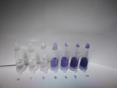 1.3:吸取10滴純凈水于檢測管,加入加1滴檢測試劑A和1滴檢測試劑B,搖勻15秒后再加2滴檢測試劑C,搖勻。