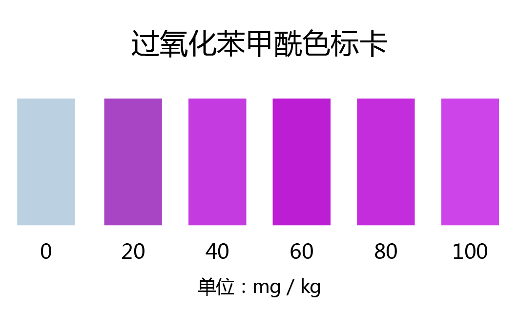 1.3:顯色10min后立即與比色卡對(duì)照,找出相應(yīng)的含量。如顏色有變紅則說明可能摻有過氧化苯甲酰,顏色越深,含量越高。