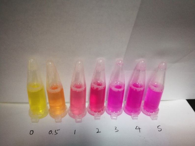 2.2:若反應(yīng)結(jié)果溶液呈明顯的深黃色和淡粉紅色,表示被檢樣品中含有重金屬鎘,其顏色越深表示重金屬鎘的含量越高。(詳見色卡)