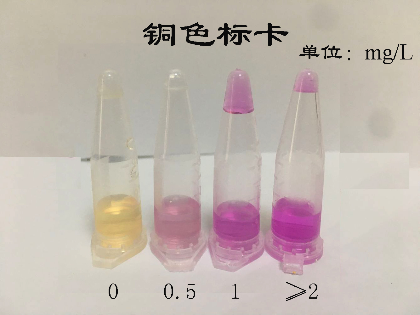2.2:若水溶液呈紫色,說明溶液中存在銅元素。顏色深淺與含量成正比。(見比色卡)